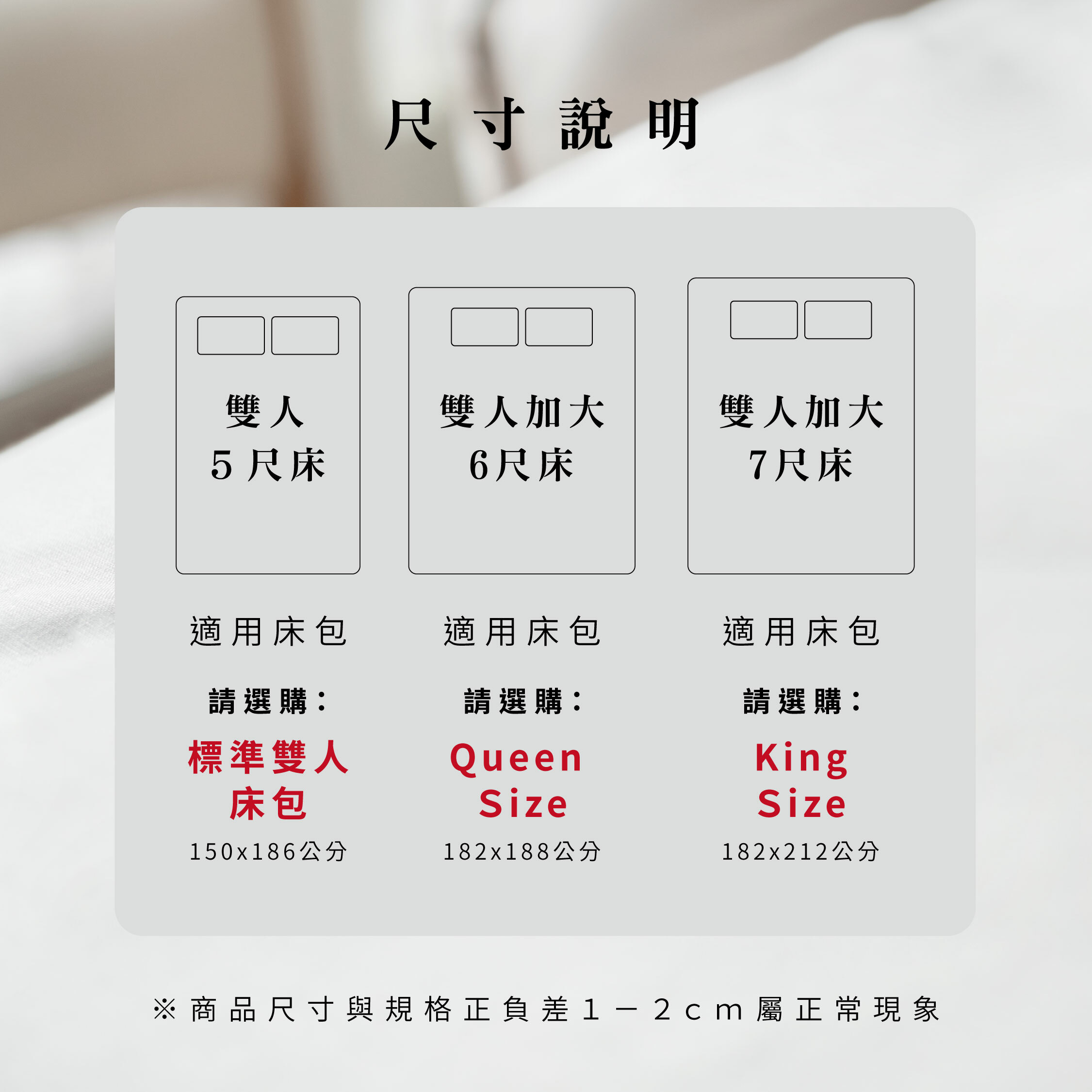 床包尺寸:標準、Queen size、King size