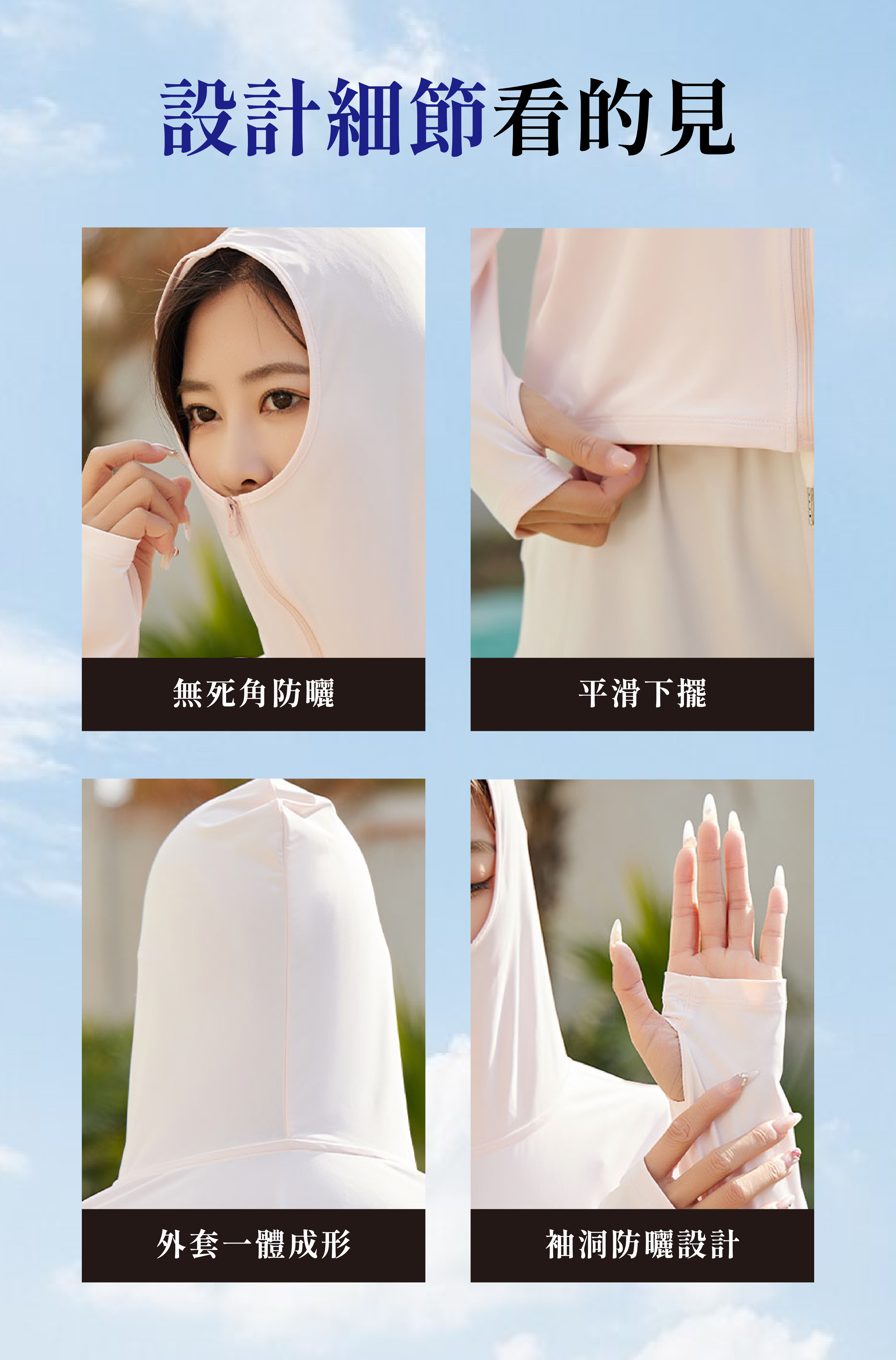 商品機能 / 全方位防曬/瞬間冰感/透氣孔洞散熱/安全反光設計/手袖+指套全方位防曬設計